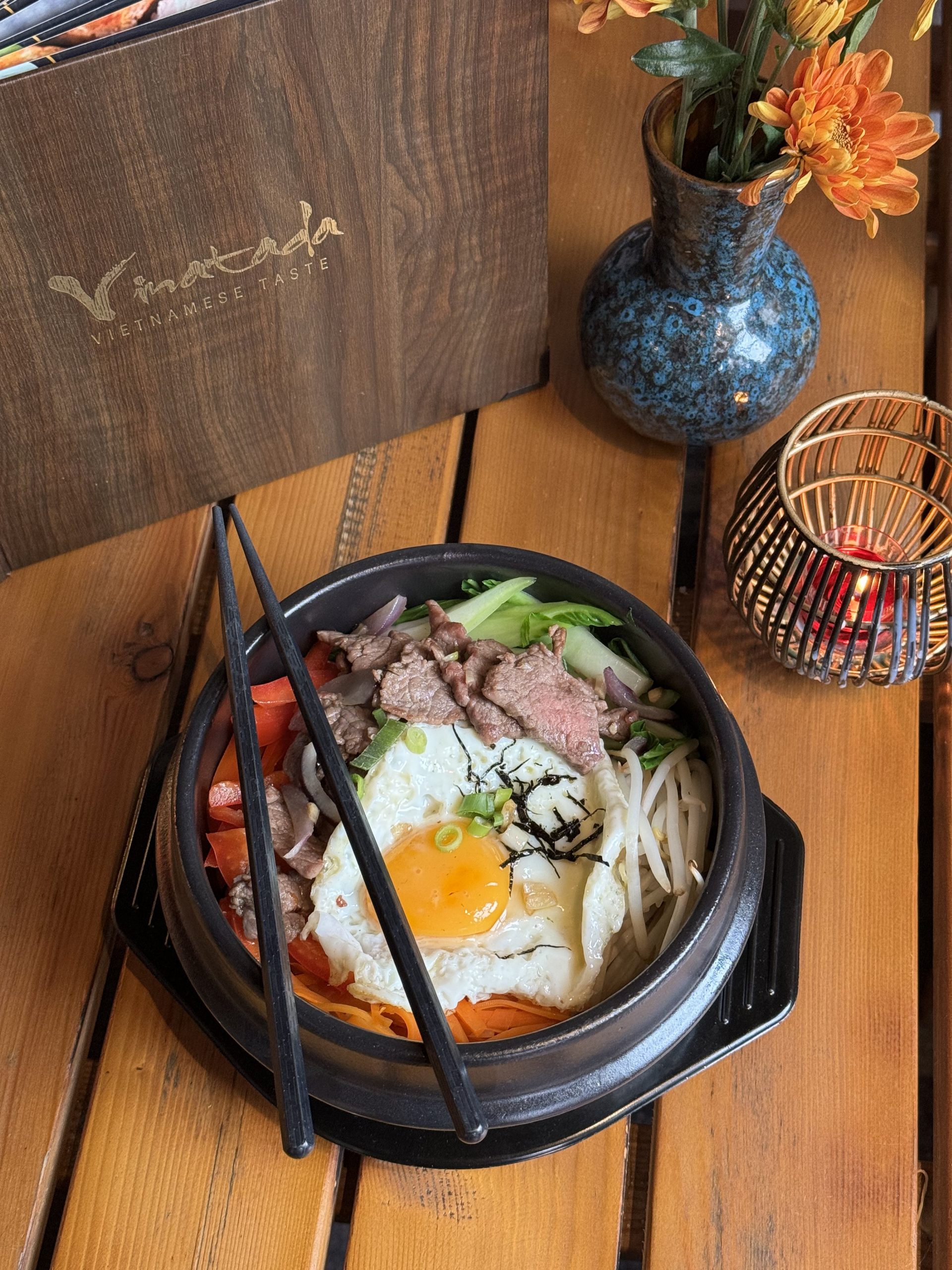 Gemüse dazu einem rohen Ei und chili bibimbapsoße oder bibimbapsoße, dazu zur Auswahl