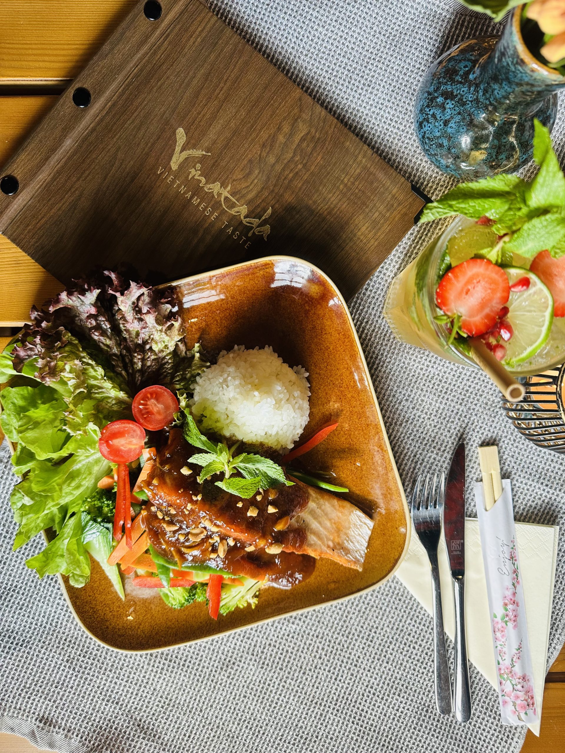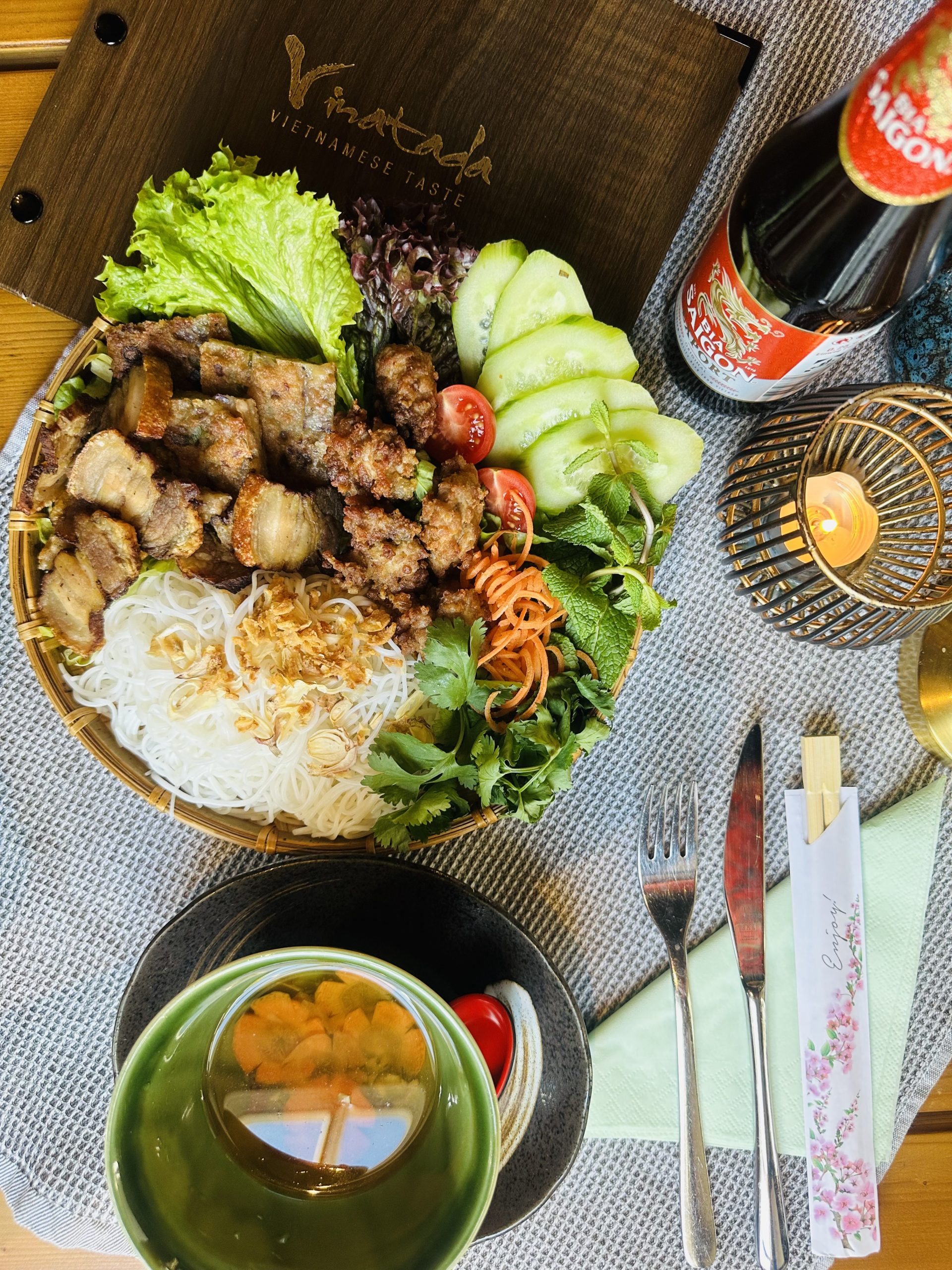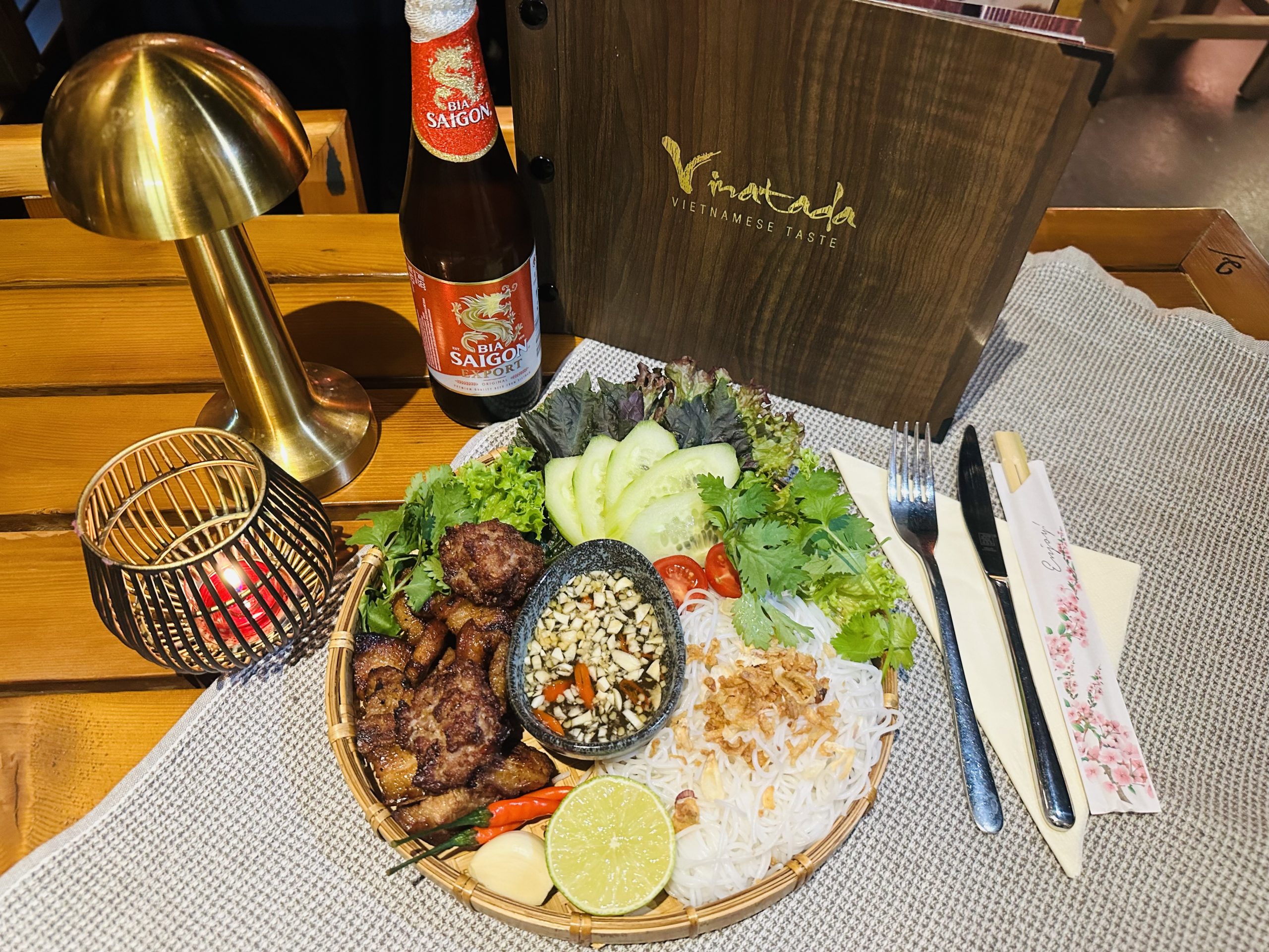 Gegrilltem Schweinefleisch, Reisnudeln, asiatischen Kräutern, Salat und Dip-Sauce.